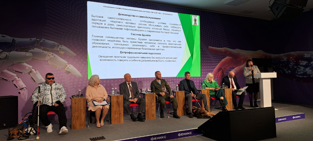 Учащийся профессионального отделения ЦРС ВОС Морозов Федор выступил с сообщением «Популяризация технического средства реабилитации - собаки-проводника», а выпускник профессионального отделения Яковлев Николай рассказал «О роли ВОС в реабилитации ветеранов боевых действий». Много добрых слов о нашем Центре, преподавателях было сказано и от других ребят - участников СВО, тех, кто ранее учился у нас.