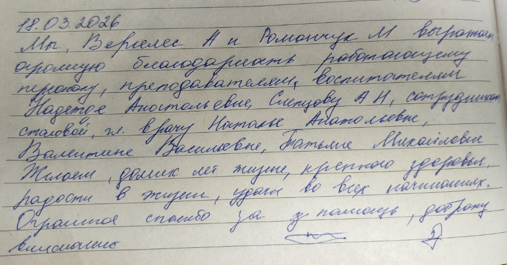 Мы, Вергелис А. и Романчук М. выражаем огромную благодарность работающему персоналу: преподавателям, воспитателям, культработникам- Сухановой Надежде Анатольевне, Слепцову Александру Николаевичу, сотрудникам столовой, главному врачу Писчиковой Наталье Анатольевне, администрации- Плаксиной Валентине Васильевне, Мозгляковой Татьяне Михайловне.